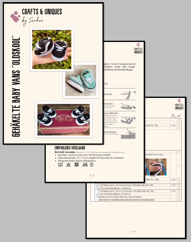 Dive into the wonderful world of crochet and create your own baby Vans "Old Skool" shoes. My comprehensive DIY crochet guide in PDF format (13 pages) enables you to make these adorable shoes yourself. Perfect for passionate crochet enthusiasts who enjoy making their own.